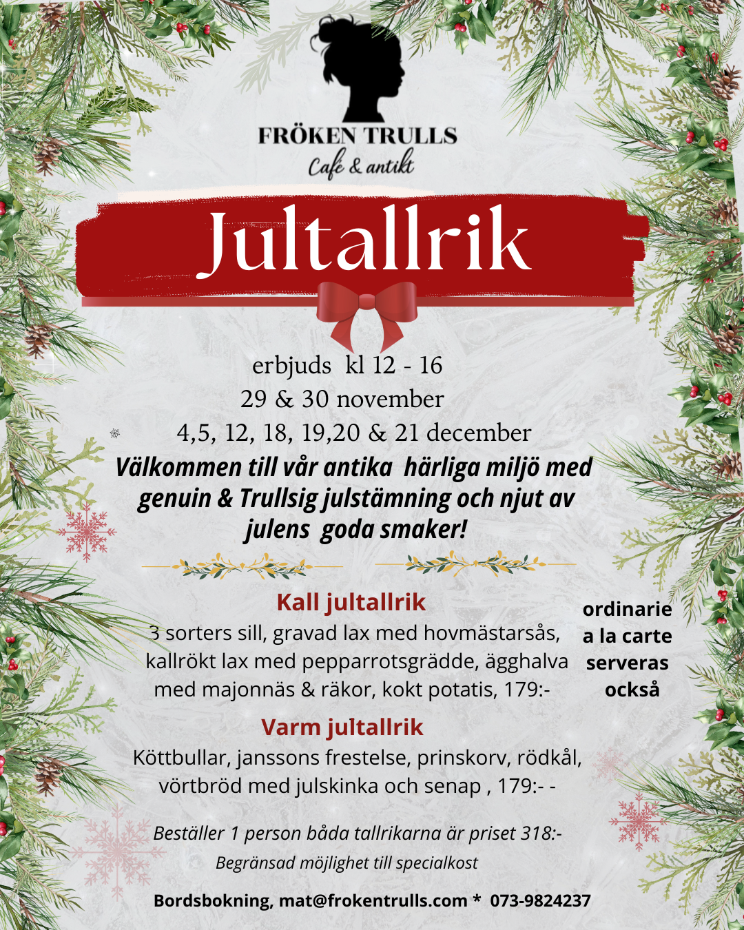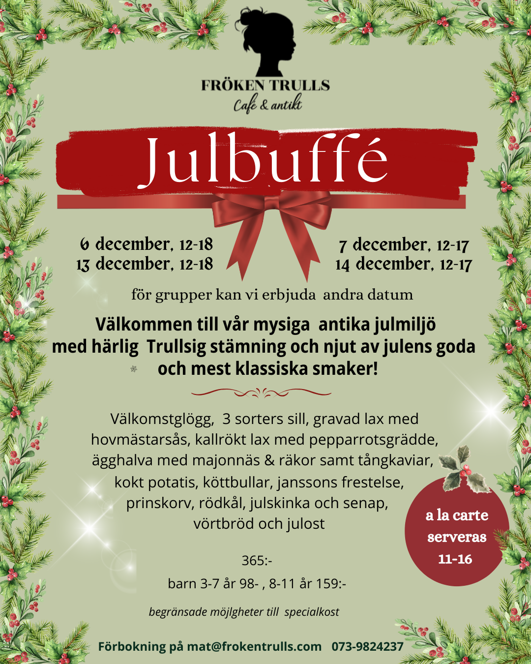 Är ni en större grupp som vill gästa oss vid annat tillfälle eller ta del av något av våra erbjudanden en annan dag eller tid, kontakta oss för vidare information: mat@frokentrulls.com alt 076-026 51 35